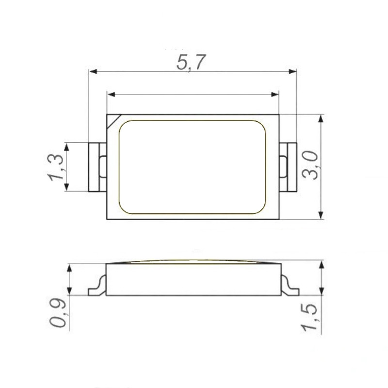 Светодиоды типа 5730 в настоящее время одни из самых распространенных моделей полупроводниковых излучающих приборов видимого спектра за счет хорошего сочетания габаритов, яркости и потребляемого тока. Конструкция светодиода представляет собой кристалл полупроводника на основании из медной пластины, размещенный в корпусе из термостойкого пластика. Для рассеяния излучения поверх кристалла укреплена линза, залитая оптической эпоксидной смолой.