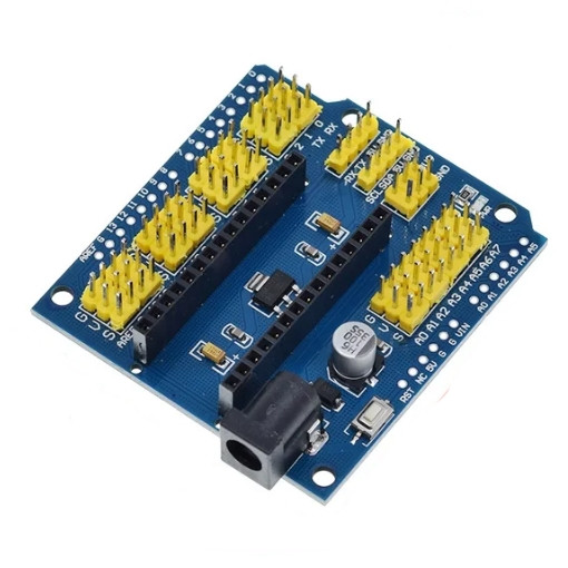 интернет-магазин радиотоваров и инструментовПлата расширения для Arduino Nano 3.0 выводит все пины для удобного использования с модулями, подключающимися с помощью трёх контактов. Итого, каждый вывод Arduino имеет в составе своей гребенки и землю, и питание, что решает самую насущную проблему – малое количество контактов питания.