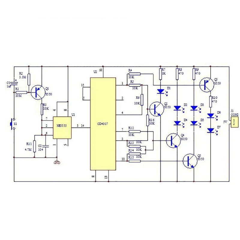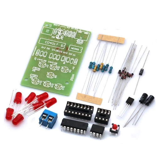 Этот набор для пайки имитирует обычные игральные кости, но в электронном виде. При нажатии кнопки запускается генератор, и 7 красных светодиодов начинают быстро мигать, отображая разные точки от 1 до 6. Когда кнопку отпускают, мигание постепенно замедляется, и остаётся случайное значение — как при броске настоящего кубика. Отличный проект для практики пайки, обучения электронике и просто для развлечения.