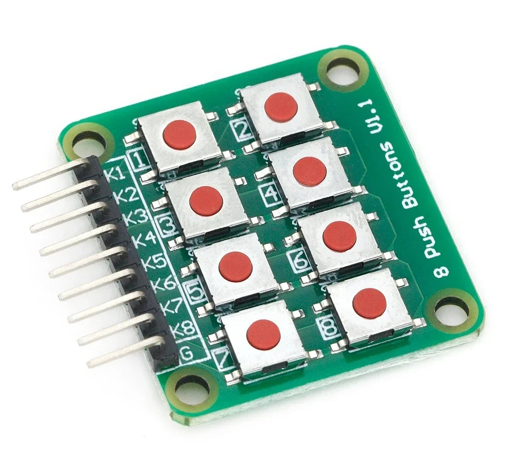интернет-магазин радиотоваров и инструментовМодуль клавиатуры включает 8 тактовых кнопок. Кнопки организованы по 4 в 2 ряда. Каждая кнопка коммутирует землю на отдельный выход K1…K8. Питание модулю не требуется. Привязка к высокому уровню осуществляется средствами микроконтроллера.