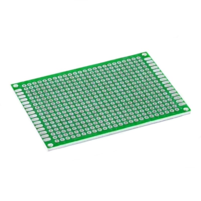 Двухсторонняя распаечная макетная плата выполнена из фольгированного стеклотекстолита. Размер платы составляет 4×6 см.