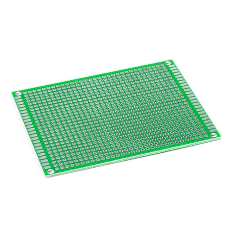 Двухсторонняя распаечная макетная плата выполнена из фольгированного стеклотекстолита. Размер платы составляет 7×9 см.