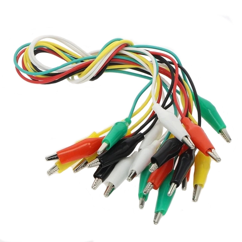 Соединительные провода с зажимами крокодил на одном конце и зажимами крокодил на другом. Длина 20см. Крокодилы в мягкой изоляции. Разные цвета (5 цветов).